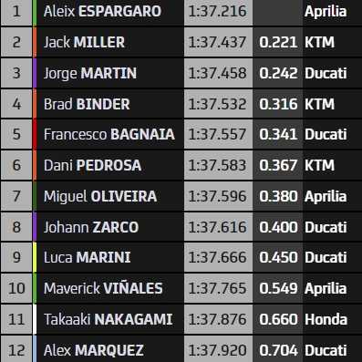 Passés par la Q1 quelques minutes plus tôt, Brad Binder (4e) et Francesco Bagnaia (5e) s’en tirent bien et ouvriront la deuxième file. Ils y retrouveront le pilote d’essai Dani Pedrosa (6e), impressionnant wild-card ce week-end. Sa présence donne des ailes aux KTM RC16 qui sont trois dans le top-10 ce samedi matin. Septième, Miguel Oliveira fait office de meilleur pilote satellite pour 20 millièmes devant Johann Zarco (8e), et 70 devant Luca Marini (9e). Maverick Vinales a dû assister, impuissant 10e, au triomphe de son coéquipier qu’il tentera de rejoindre en course. Il aura à sa droite la première Honda, celle de Takaaki Nakagami (11e), sur le circuit de son meilleur résultat en MotoGP – une 4e place en 2020. Alex Marquez ferme la marche de la Q2 au 12e rang.