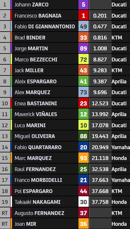 Marco Bezzecchi sauve les meubles au sixième rang après avoir battu le héros local Jack Miller. Aleix Espargaro prend les honneurs de meilleur pilote Aprilia au huitième rang. Alex Marquez et Enea Bastianini complètent le top-10 devant la deuxième RS-GP du jour, celle de Maverick Vinales, onzième. Plus loin, Fabio Quartararo va chercher sur le fil les 2 points de la quatorzième place face à M. Marquez.