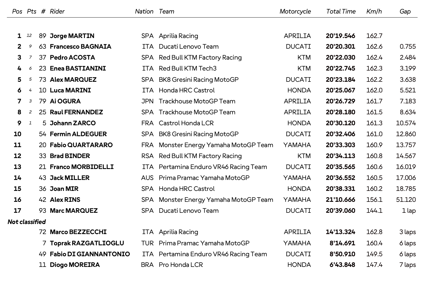 À noter les chutes des trois favoris au podium : Marc Marquez et Fabio Di Giannantonio, lors d'un dépassement de l'Espagnol sur l'Italien, et Marco Bezzecchi, alors qu'il entamait une folle remontée, à trois tours de la fin.