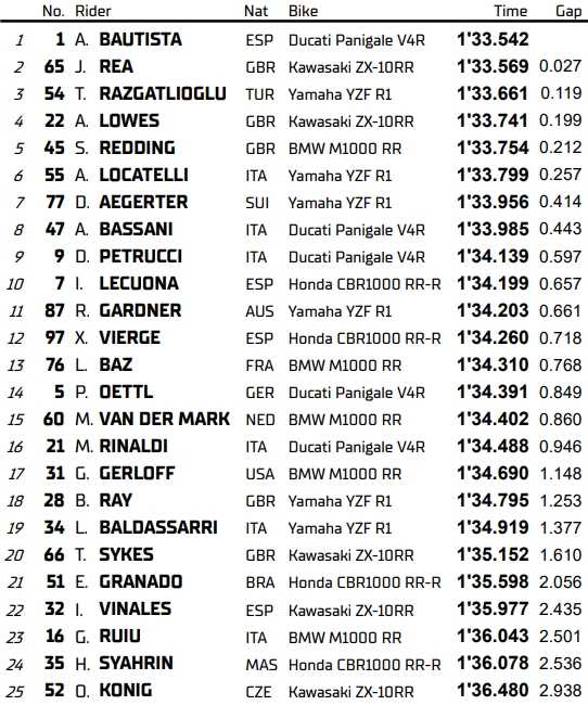 Il s’en est fallu de peu, mais Alvaro Bautista est sorti vainqueur du duel pour la pole position WorldSBK à Assen. Le leader du championnat a devancé de 27 millièmes la Kawasaki de Jonathan Rea, qui tentera de lui subtiliser cet avantage au premier virage. Toprak Razgatlioglu et sa Yamaha complètent la première ligne. De retour de blessure, le Français Loris Baz s’élancera 13e.