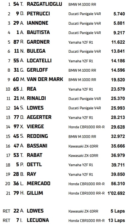 Et de 8 ! En tête du premier au dernier tour, Toprak Razgatlioglu a remporté la Course 1 de Most, célébrant son 8e succès d'affilée en World Superbike. Il s'impose devant les anciens pilotes MotoGP Danilo Petrucci (2e) et Andrea Iannone (6e). Le Turc porte son avance au championnat à 56 points sur Nicolo Bulega et 67 sur Alvaro Bautista.