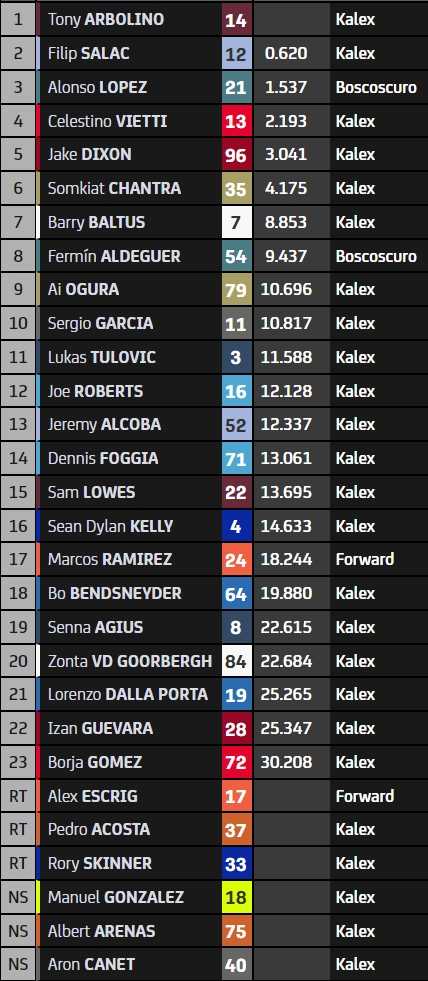 Championnat Moto2 actuel : 1. Tony Arbolino 99 pts, 2. Pedro Acosta 74 (-25), 3. Alonso Lopez 61 (-38), 4. Filip Salac 60 (-39), 5. Aron Canet 52 (-47)…