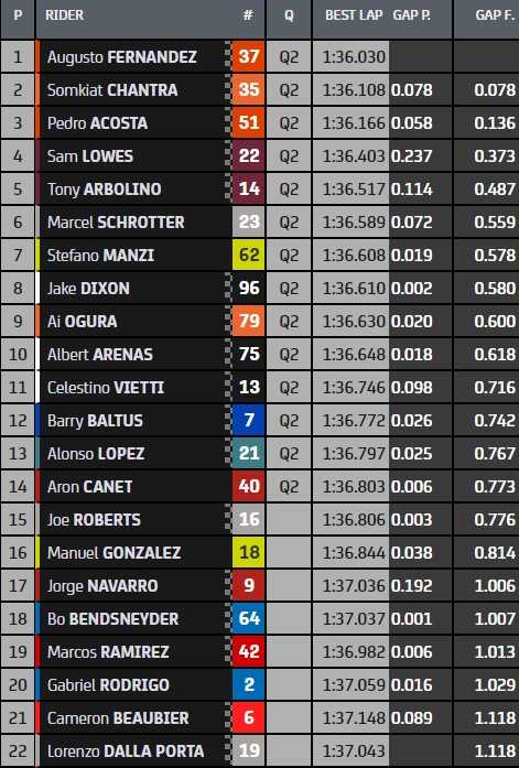 Les pilotes Ajo Augusto Fernandez et Pedro Acosta se disputent les commandes du peloton Moto2 au Mans, avec Somkiat Chantra pour ne pas les laisser seuls à la fête. Douzième, le Belge Barry Baltus continue de progresser, et fait partie du top-14 provisoirement qualificatif pour la Q2.