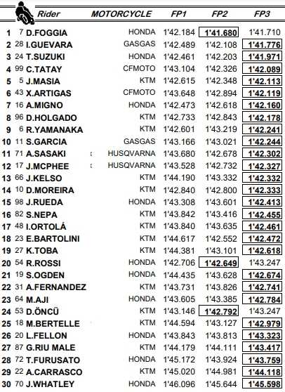 Le leader du championnat Moto3, Sergio Garcia, a réussi à rentrer dans le top-14 directement qualificatif pour la Q2 lors de la troisième séance d’essais libres. Dennis Foggia garde les commandes du classement grâce à son chrono de la veille. Vingt-sixième, Lorenzo Fellon devra disputer le repêchage.
