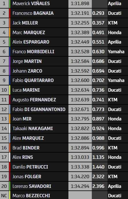 Maverick Vinales a signé le meilleur temps de la séance d’essais libres du Grand Prix de France, ce samedi matin. Le pilote Aprilia a devancé Francesco Bagnaia sur un circuit du Mans qui n’est pas encore entièrement sec. Johann Zarco (8e) et Fabio Quartararo (9e) ont fini dans le top-10. Le choix de pneus soft/soft semble être celui qui sera fait par la grille pour les courses. Place aux qualifications.