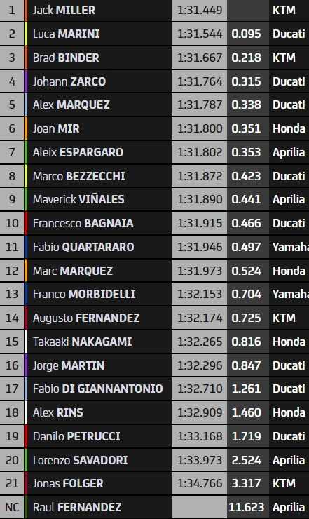 Deux semaines après son double-podium à Jerez, l’équipe officielle KTM a marqué de son empreinte la première séance d’essais du Grand Prix de France, avec Jack Miller au sommet et Brad Binder troisième. Le Français Johann Zarco est dans le top-10 directement qualificatif pour la Q2, en attendant la deuxième séance d’essais. Pas Fabio Quartararo, 11e et dépassé en toute fin par Francesco Bagnaia (10e).