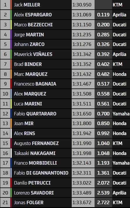 Tombé dans son dernier tour, Marc Marquez (8e) a toutefois sauvé une place en Q2 pour son retour à la compétition, terminant juste derrière la KTM de Brad Binder (7e). Il met derrière lui son frère Alex (10e), mais aussi le leader du championnat, Francesco Bagnaia (9e), pas au mieux ce vendredi. Attention, toutefois, à ne pas se lancer trop tôt dans les pronostics : Pecco a dû passer par le repêchage à Jerez, avant d’entrer en Q2 puis de gagner le dimanche.
