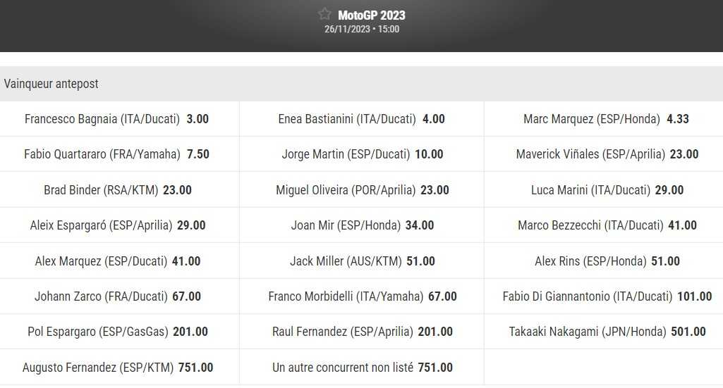 Le doublé de Francesco Bagnaia est en effet coté à 3,00 sur Bwin, ce qui signifie que 10 euros de misés sur le pilote Ducati rapporteraient 30 euros en cas de succès. Il s’agit de la cote la plus basse devant celle attribuée à son coéquipier Enea Bastianini (4,00). Les deux hommes ont animé la fin de la saison 2022 et sont attendus aux premiers postes en 2023.