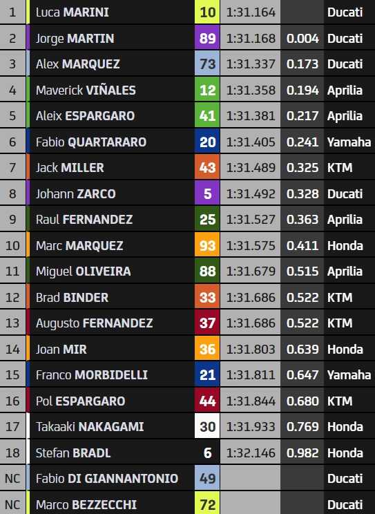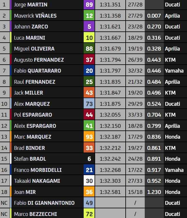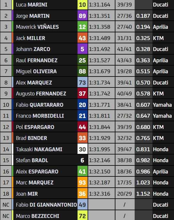 10h35 : On s’approche de la barre des 1’31 pour Luca Marini (1’32.059), A. Marquez (1’32.165) ou encore Binder (1’32.342), qui améliorent la référence d’A. Espargaro.