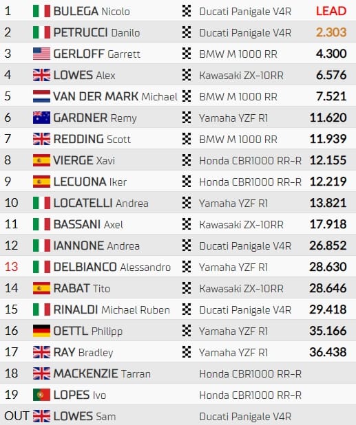 En l'absence de Toprak Razgatlioglu et Alvaro Bautista, tous deux blessés, Nicolo Bulega fait la bonne opération du jour. Il revient à 55 points du leader du championnat, et met son coéquipier Bautista à bonne distance. La suite à Crémone, en Italie, dans deux semaines.