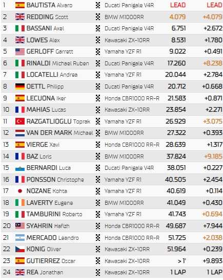 Meilleur pilote Kawasaki du jour, Alex Lowes (4ème) termine au pied du podium devant l’Américain Garrett Gerloff, premier représentant de Yamaha deux places devant Andrea Locatelli (7ème). Le rookie allemand Philipp Oettl (8ème) enregistre le meilleur résultat de sa carrière, devant la première Honda du jour d’Iker Lecuona (9ème). Meilleur français, Lucas Mahias ferme la marche du top-10.