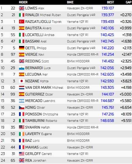 Les pilotes WorldSBK n’avaient fait que trois ou quatre tours à Magny-Cours, quand une averse est venue perturber la première séance d’essais libres. Le classement s’en est trouvé figé, avec Alex Lowes au sommet du classement devant Michael Ruben Rinaldi et Toprak Razgatlioglu. Peu significatif pour le moment, car les temps ont été réalisés lors des premières minutes de la séance, sans que personne ne force.