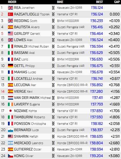 Challengé par Axel Bassani pour la place dans l’équipe d’usine Ducati en 2023, Michael Ruben Rinaldi s’élancera septième, juste devant son compatriote italien. Le Français Loris Baz fermera la marche de la troisième file à domicile, dans une Superpole très serrée puisqu’il ne passe qu’à 2 dixièmes du top-5. Second tricolore, Lucas Mahias (11ème) n’a manqué que de 3 millièmes pour intégrer le top-10. Tout proche de la barre des 1’37, Christophe Ponsson (19ème) tentera en course de remonter vers la zone des points.