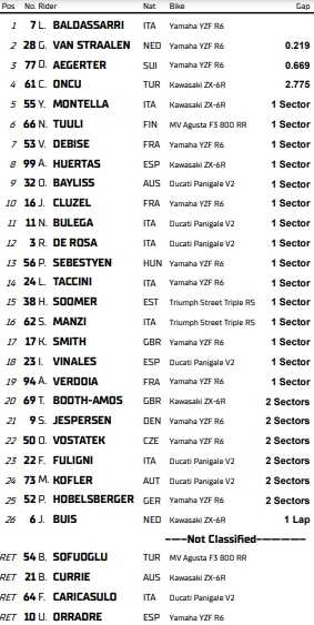 Vainqueur de la Course 1 Supersport de Magny-Cours, après que Federico Caricasulo ait été victime d’une panne, Lorenzo Baldassarri est revenu à 5 points de Dominique Aegerter, toujours leader du championnat du monde. Cela fait 59 points repris en trois courses, et confirme que la lutte pour le titre est relancée. La manche a été arrêtée quelques tours avant le drapeau à damiers, en raison d’un drapeau rouge sorti après une chute.