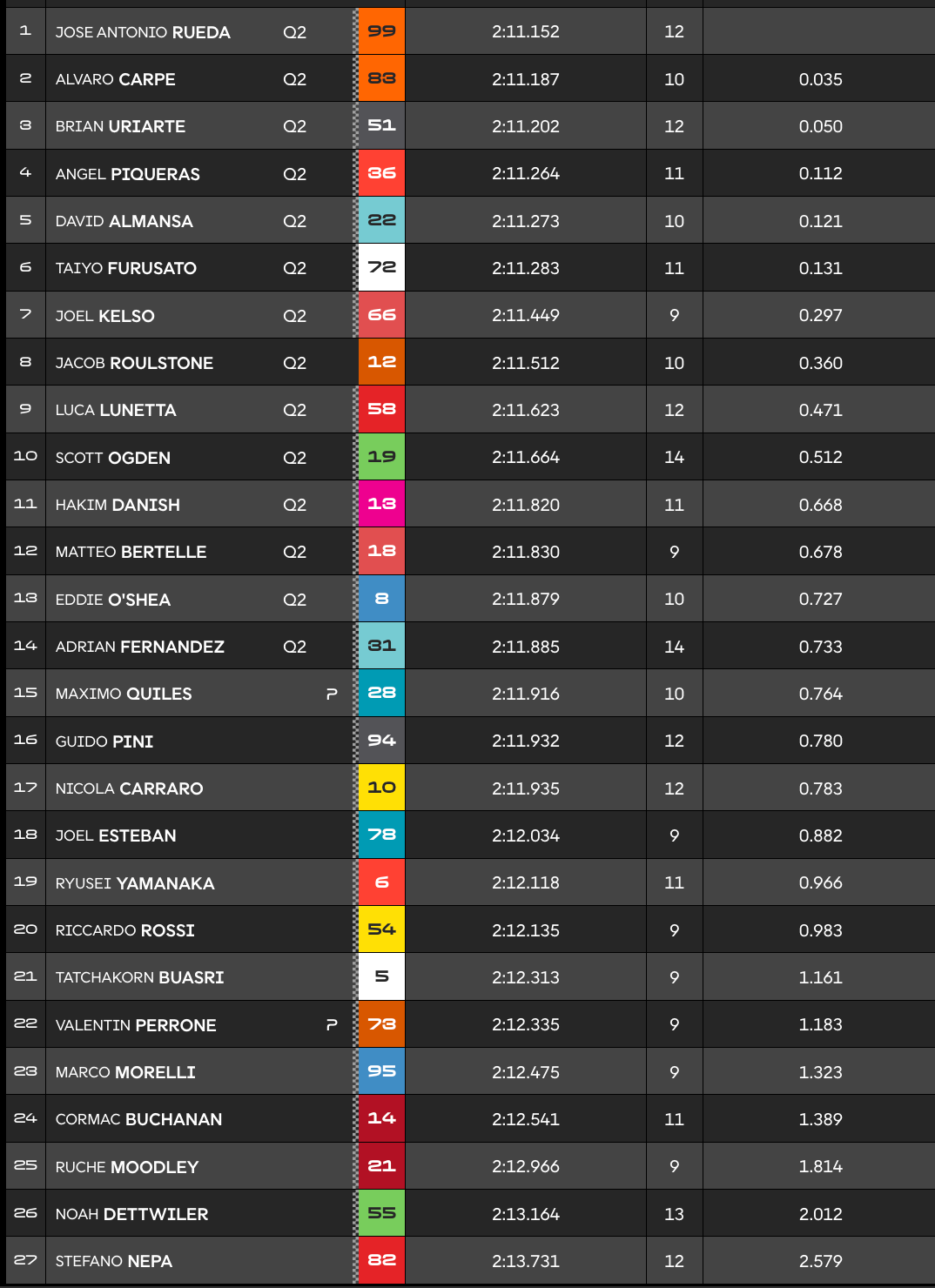 Angel Piqueras, leader ce matin, a terminé quatrième devant les Honda de David Almansa et Taiyo Furusato. Les deux Autraliens, Joel Kelso et Jacob Roulstone, devançaient Luca Lunetta et Scott Ogden.