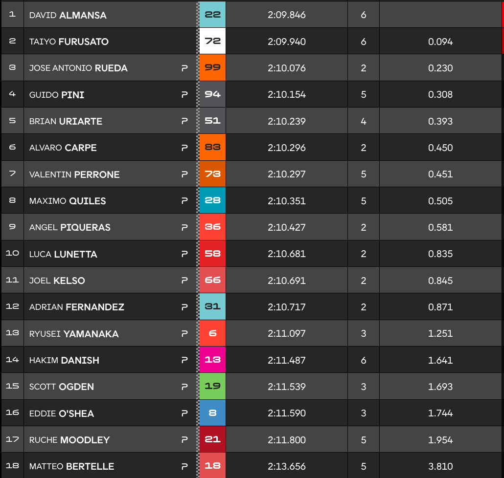 Almansa a privé José Antonio Rueda de la pole dans son tout dernier tour lancé. L’Espagnol s’élancera devant Taiyo Furusato et Rueda. Guido Pini mènera la deuxième ligne devant Brian Uriarte qui continue de s’illustrer pour le deuxième Grand Prix de sa carrière, et Alvaro Carpe.