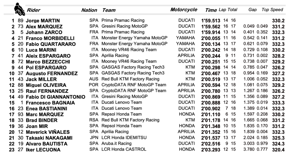 Luca Marini place une autre Ducati en sixième position devant l’Aprilia d’Aleix Espargaro et Marco Bezzecchi. Pol Espargaro est le premier représentant KTM/GASGAS de la hiérarchie au neuvième rang devant ses homologues du clan autrichien Augusto Fernandez et Jack Miller. L’Australien dispose de nouveaux ailerons de la fourche ainsi que d’un nouvel échappement.