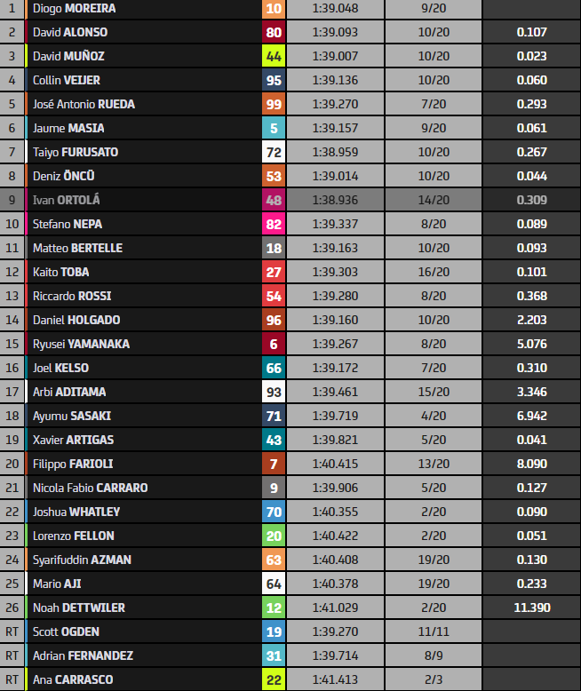 Ayumu Sasaki est le grand perdant du jour. Le Japonais, victime d’une chute dans son tour de mise en grille, a complètement manqué son départ. Parti en fond de peloton, il est remonté jusqu’au dix-huitième rang. Il compte désormais seize points de retard sur Jaume Masia au championnat. En difficulté tout le week-end, le Français Lorenzo Fellon conclut la course au vingt-troisième rang.