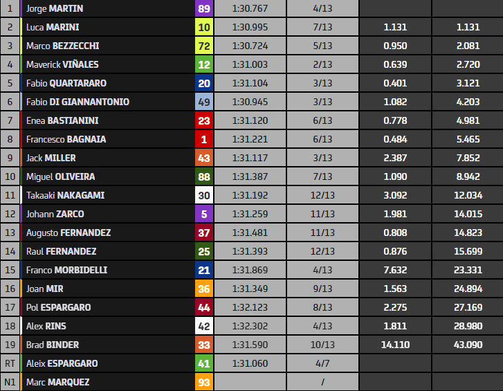 Fabio Quartararo termine à une solide cinquième place. Le leader de Yamaha semblait aller de mieux en mieux au fil des tours, une prestation encourageante pour la longue course. Fabio Di Giannantonio (Gresini Racing) se classe sixième devant les deux Ducati officielles d’Enea Bastianini et Francesco Bagnaia. Le champion en titre n’est plus en tête du championnat, pour la première fois depuis Jerez.