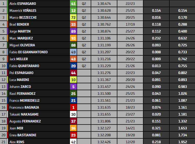 Rappel des règles : à l’issue des deux séances d’essais MotoGP, les 10 plus rapides sont qualifiés pour la Q2, « finale » de la qualification. Les autres vont en Q1, où les 2 meilleurs gagnent un ticket pour la Q2. Pour les catégories Moto2 et Moto3, c’est un peu différent : ce sont les 14 pilotes les plus rapides (au lieu de 10) après trois séances (au lieu de deux). Quant au repêchage, entrent en Q2 les 4 meilleurs (au lieu des 2). Cela fait donc 12 pilotes en Q2 en MotoGP, 18 en Moto2 & Moto3. Le classement de la Q2 définit celui de la grille de départ pour les pilotes concernés. Pour les autres, on se reporte au classement de la Q1 (3ème place de la Q1 MotoGP = 13ème place sur la grille, 4ème place = 14ème place sur la grille…).