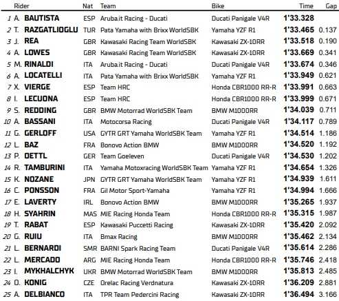 Son coéquipier Alex Lowes (+0.341) ouvrira la deuxième file devant Michael Ruben Rinaldi (+0.346), vainqueur en ces lieux l’an dernier. L’Italien ferme la marche d’un top-5 qui se tient en moins de 4 dixièmes, et fait office de premier pilote local puisqu’il devance son compatriote Andrea Locatelli (+0.621). Suivront en troisième ligne les rookies de chez Honda, Xavi Vierge (+0.663) et Iker Lecuona (+0.671), avec à leur côté la première BMW du classement, celle de Scott Redding (+0.711).