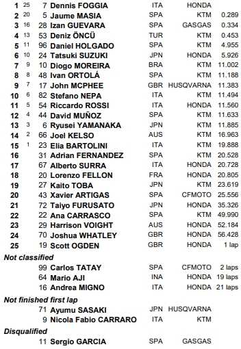 Vainqueur à deux reprises sur la piste italienne l’an dernier, le pilote Leopard a fait la passe de trois en remportant la bagarre qui l’opposait à Jaume Masia, Izan Guevara et Deniz Öncü, qui finissent tous trois dans cet ordre derrière lui. Le rookie Daniel Holgado complète le top-5, son meilleur résultat en carrière et quelques précieuses unités de prises à Diogo Moreira (7ème) dans la lutte pour le titre de meilleur débutant.