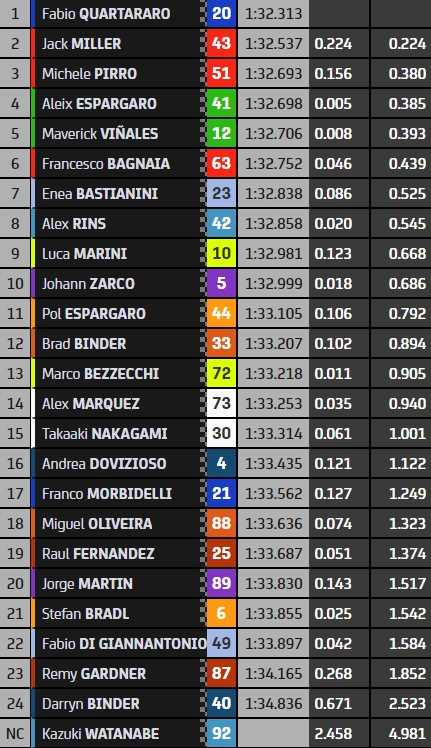 En l’absence de Joan Mir, blessé et remplacé par Kazuki Watanabe (25ème), Alex Rins (8ème) représente les seules chances de bon résultat de Suzuki, et figure en première partie de classement. Comme fréquemment cette saison, Honda et KTM ne sont pas dans le top-10, mais en sont proches avec Pol Espargaro 11ème pour le HRC, suivi de Brad Binder au 12ème rang pour la firme autrichienne.