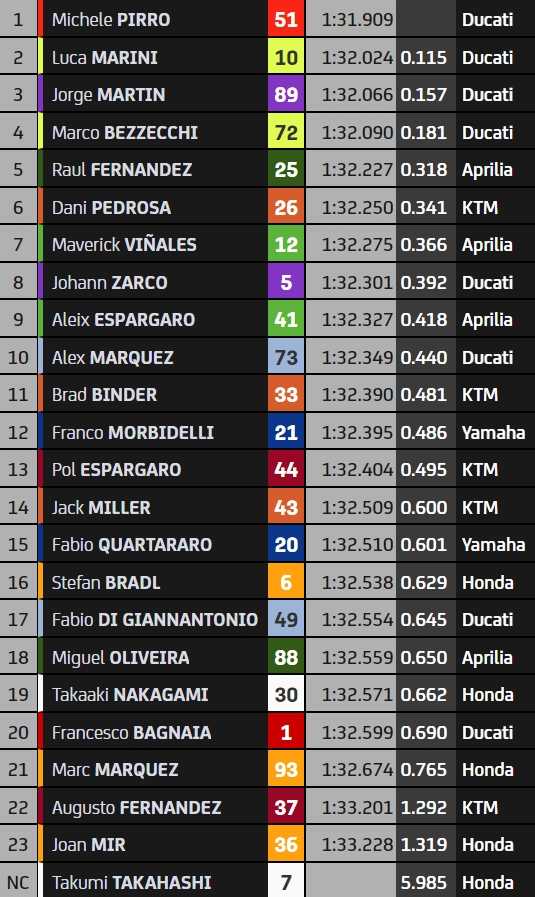 Excellent à domicile, Pirro mène un quadruplé Ducati où on retrouve Luca Marini (+0.115), au lendemain de l’annonce de sa prolongation dans l’équipe VR46 en 2024, Jorge Martin (+0.157) motivé par la possibilité de reprendre des points à Bagnaia ce week-end, et Marco Bezzecchi (+0.181) rapide malgré une main touchée lors de l’accrochage au départ de Barcelone, cinq jours plus tôt.