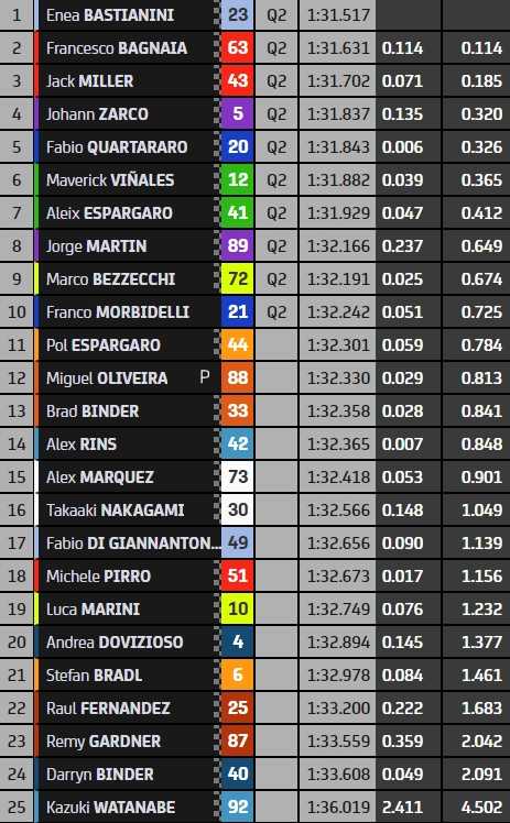 Au sommet du classement avant la charge des Ducatistes, Fabio Quartararo (5ème) complète finalement le top-5. Il est seul pilote équipé d’une moto japonaise du top-9 puisque suivent derrière lui les Aprilia RS-GP de Maverick Viñales (6ème) et Aleix Espargaro (7ème), la Ducati Desmosedici GP22 de Jorge Martin (8ème) et la version GP21 du chef de file des rookies, Marco Bezzecchi (9ème). Franco Morbidelli (10ème) ferme la marche du top-10 pour Yamaha, sur une piste où il espère redresser la barre d’une saison 2022 jusqu’à présent désastreuse.