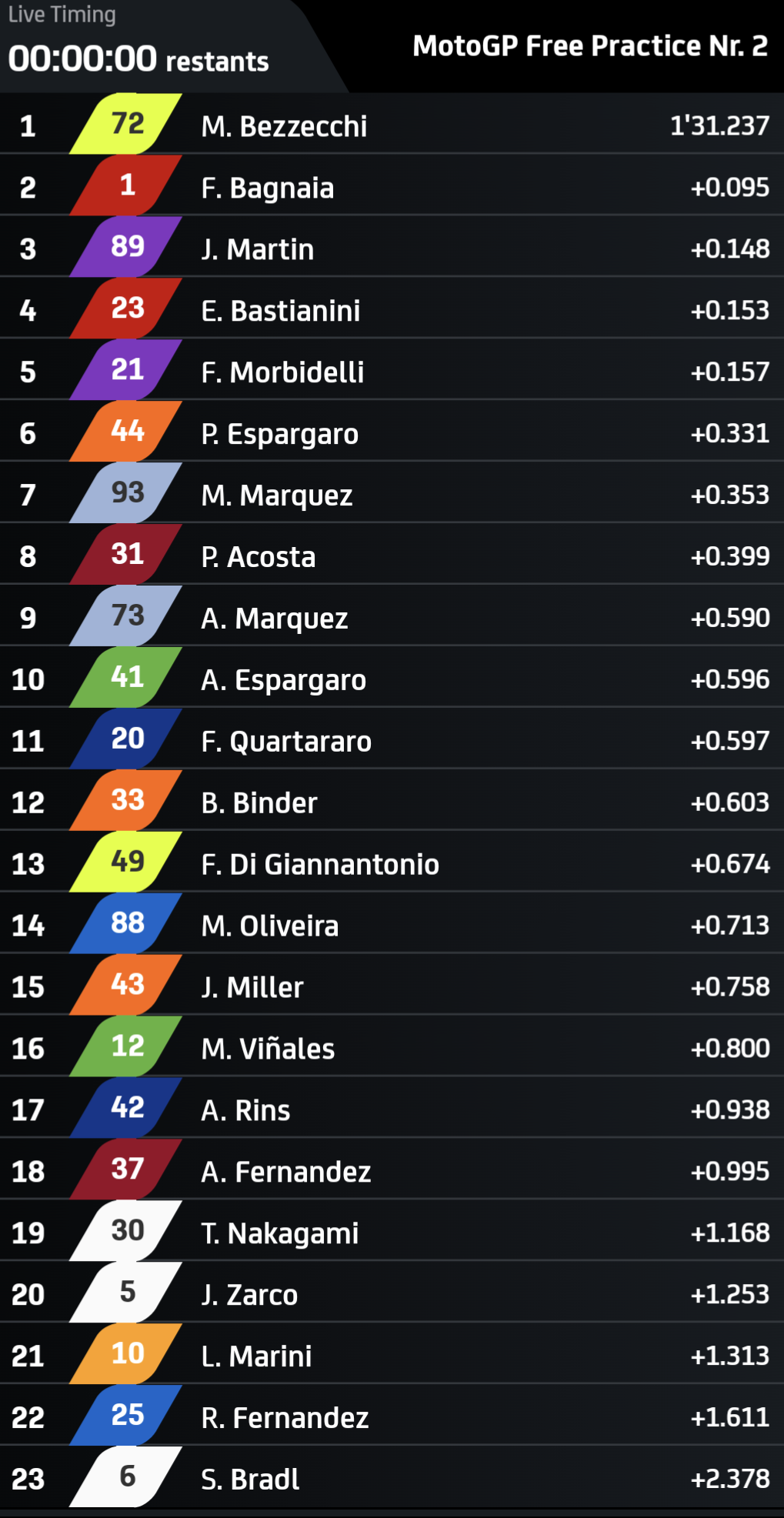 Marco Bezzecchi a signé le meilleur temps de la deuxième séance d'essais libres, ce samedi matin, juste devant son compatriote italien Francesco Bagnaia. Cinq Ducati sont aux cinq premières places.