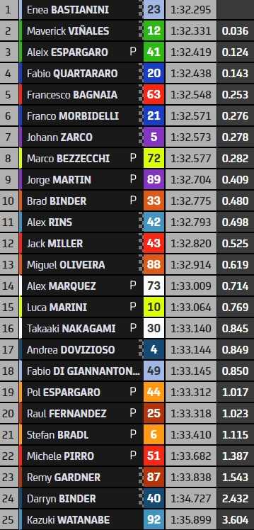 Enea Bastianini a dominé la quatrième et dernière séance d’essais libres du Grand Prix de Saint-Marin, dédiée à la préparation de la course, en devançant sur le fil les pilotes Aprilia Maverick Viñales et Aleix Espargaro. Quatrième, Fabio Quartararo a enchaîné les tours rapides et est dans le coup. Place à la qualification.