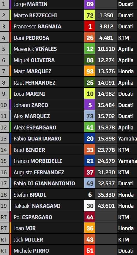 L’erreur du Sud-Africain fait de Dani Pedrosa le premier représentant de KTM au quatrième rang. Le pilote d’essai de la marque autrichienne conclut un Grand Prix fantastique et n’est pas passé loin de son premier podium depuis 2017, puisqu’il est revenu comme un boulet de canon sur Bagnaia et termine à seulement 7 dixièmes du trophée. Maverick Vinales complète le top-5 et finit meilleur pilote Aprilia devant Miguel Oliveira, vainqueur de la bagarre pour la sixième place.