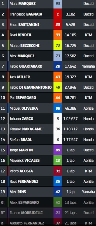 Au classement général, Francesco Bagnaia est le grand vainqueur du jour : il passe de 26 à 7 points de retard sur le leader Jorge Martin. Marc Marquez se rapproche également et se situe désormais à 53 points.