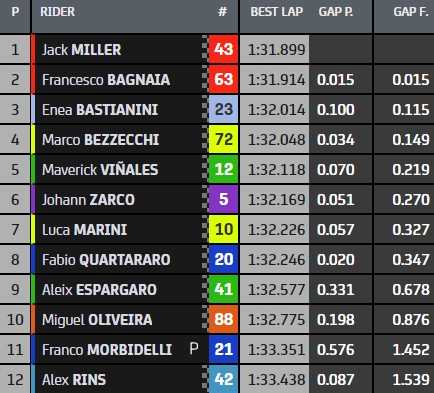 Meilleur pilote KTM du jour, Miguel Oliveira ferme la marche du top-10 de la qualification devant Franco Morbidelli, de retour en Q2 pour la première fois depuis mars. Pas à l’aise dans ces conditions, Alex Rins conclut le classement de la séance au douzième rang.