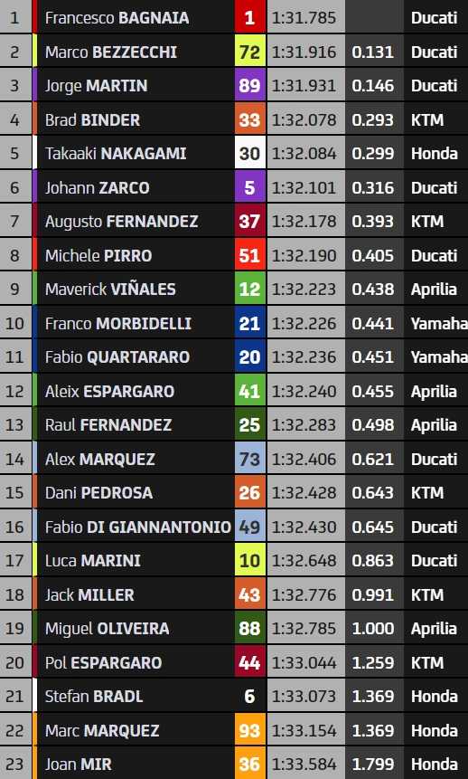 Championnat MotoGP (12/20) : 1. Bagnaia 267 pts, 2. Martin 222 pts (-45), 3. Bezzecchi 198 pts (-69), 4. Binder 171 pts (-96), 5. A. Espargaro 156 (-111)… Classement complet ici