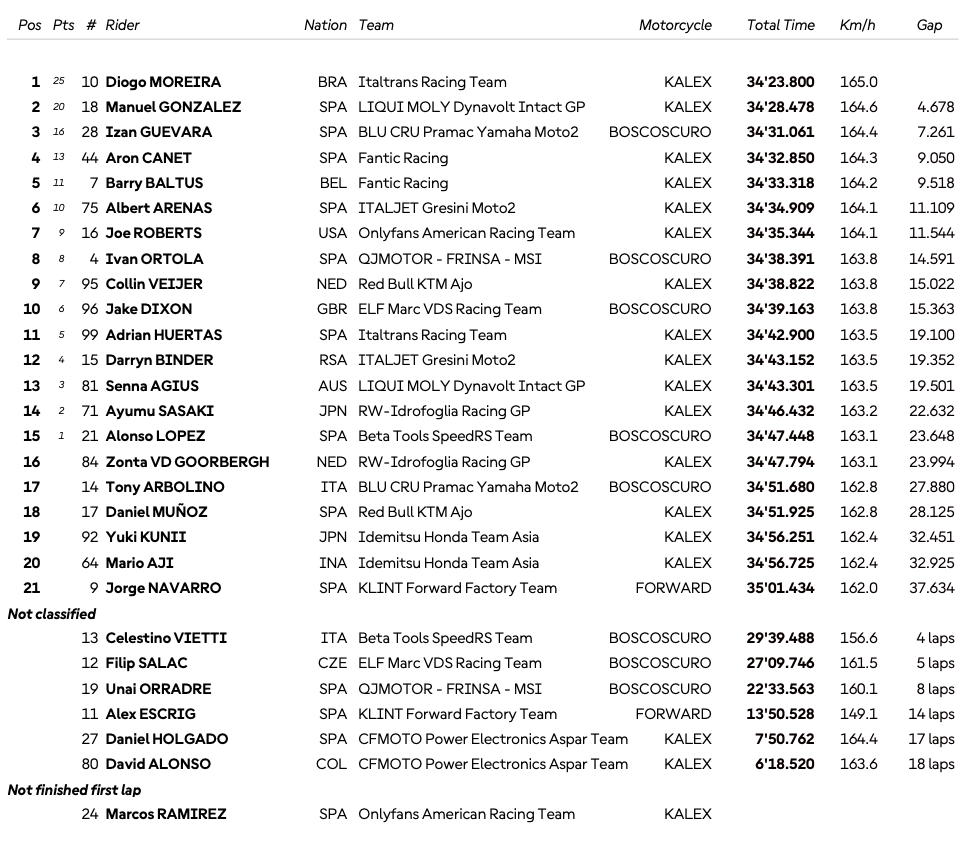 Parti de la pole position, Diogo Moreira remporte le Grand Prix d'Indonésie Moto2 et reprend quelques points à Manuel Gonzalez, toujours leader au championnat.