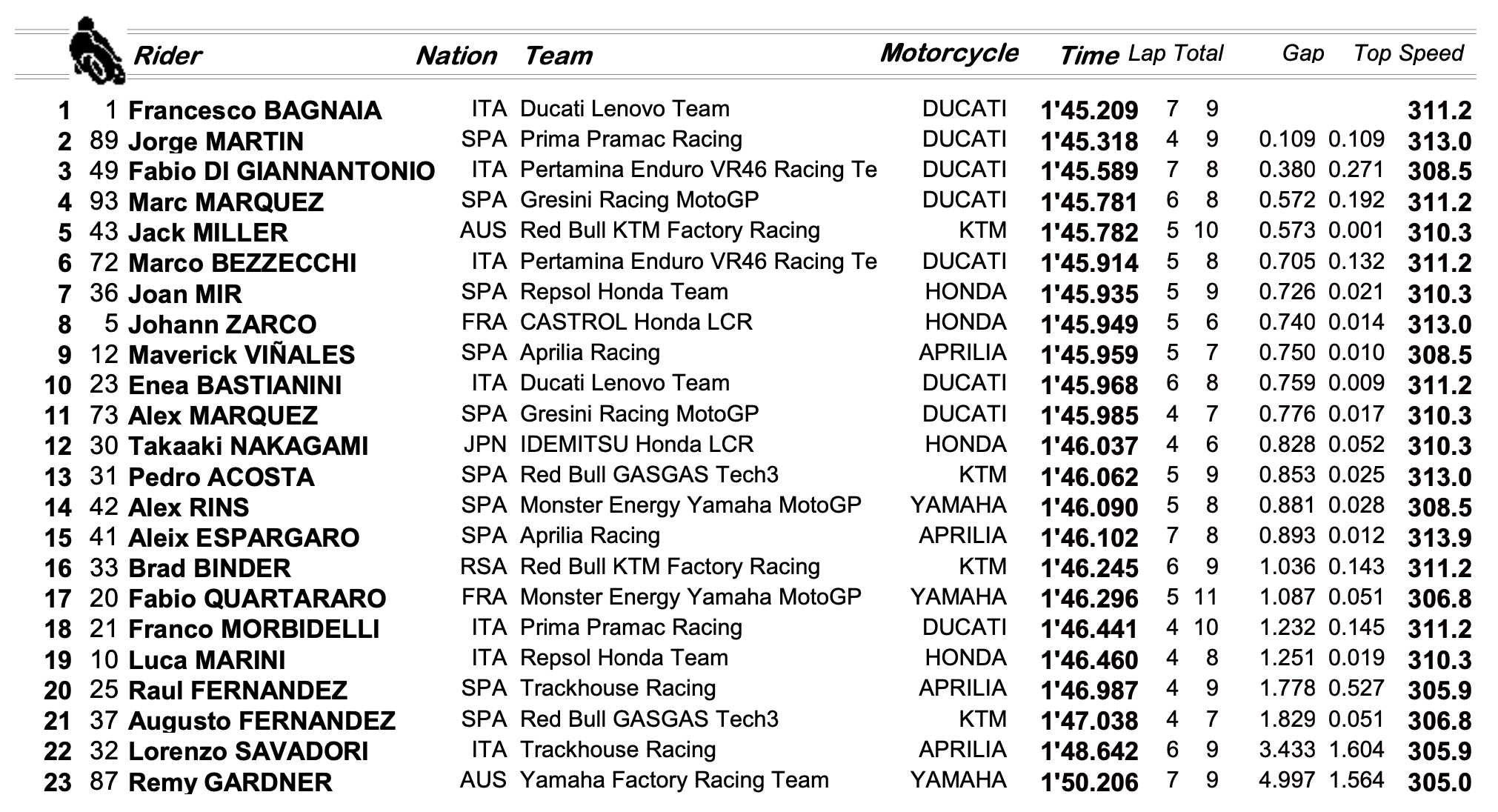 Par un climat chaud et humide, Francesco Bagnaia a signé le meilleur tour en 1'45.209 avant l'arrivée de la pluie. Jorge Martin, vainqueur dimanche dernier à Mandalika, a terminé à un peu plus d'un dixième de son adversaire. Fabio Di Giannantonio, Marc Marquez et Jack Miller fermaient les portes du Top 5.