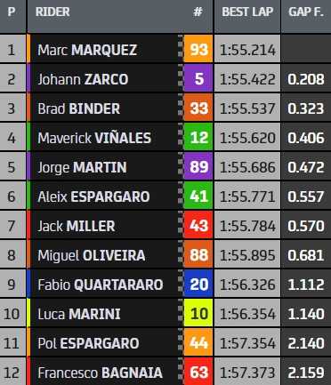 Habile dans ces conditions, Johann Zarco termine à 208 millièmes de l’Espagnol et s’assure d’une excellente deuxième place, après avoir dû passer par l’exercice de la Q1. Il aura à sa droite Brad Binder, troisième et en première ligne pour la première fois de sa carrière en MotoGP. C’est aussi, pour KTM, une première depuis la pole de Miguel Oliveira au Portugal, en novembre 2020.