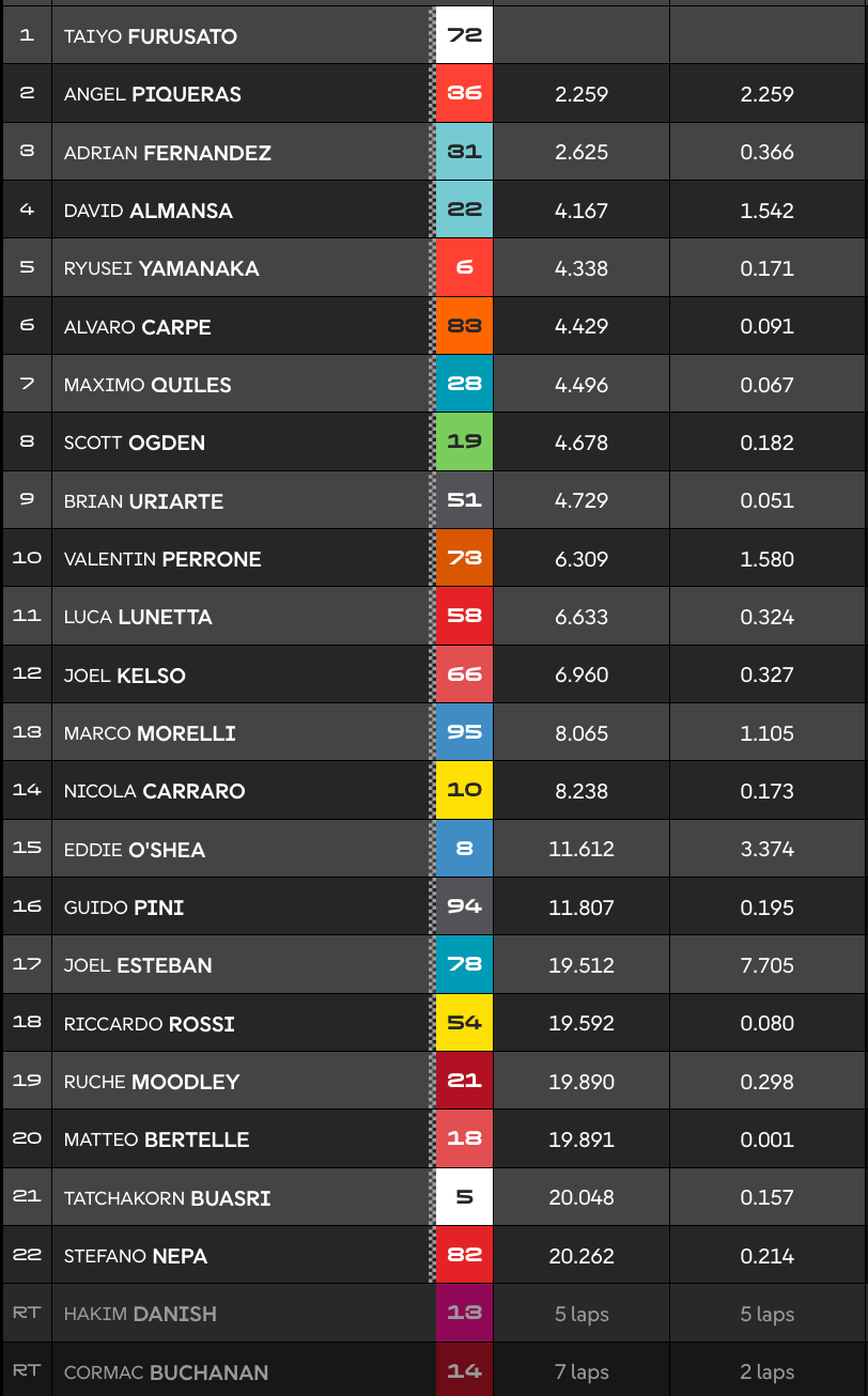 David Almansa a terminé au pied du podium devant Ryusei Yamanaka et Alvaro Carpe. Maximo Quiles, septième, remporte le titre de rookie de l’année.
