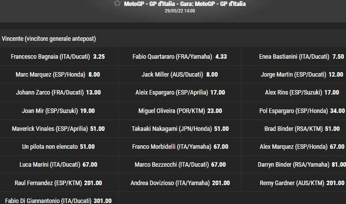 Suit Enea Bastianini, vainqueur du Grand Prix de France deux semaines plus tôt, avec une cote étonnamment haute de 7,50. Marc Marquez et Jack Miller, qui roulent toujours après leur première victoire en 2022, sont les deux derniers à être sous la dizaine (8,00). Le reste des cotes ci-dessous, relevées sur Bwin ce jeudi 26 mai, à la veille des premiers essais libres :