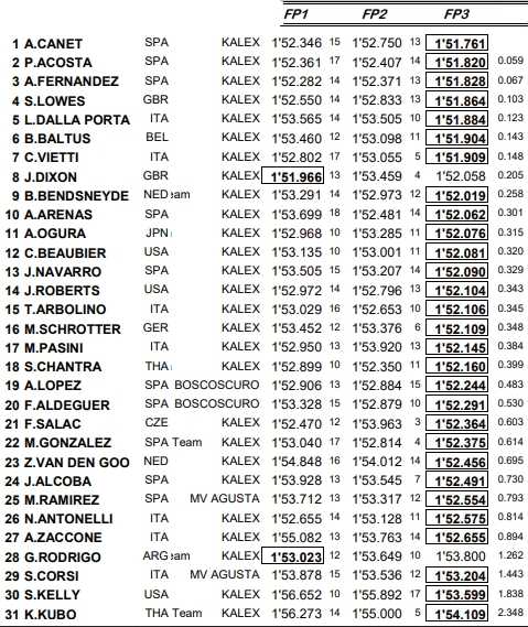 Aron Canet a signé le meilleur temps de la troisième séance d’essais libres Moto2 du Grand Prix d’Italie, quelques centièmes devant ses compatriotes espagnols Pedro Acosta et Augusto Fernandez. Le leader du championnat, Celestino Vietti, est dans le top-14 qualificatif pour la Q2 (7e). Il termine derrière Barry Baltus, sixième après être passé sous la barre des 1’52. Le jeune belge disputera la « finale » des qualifications pour la troisième fois de l’année.