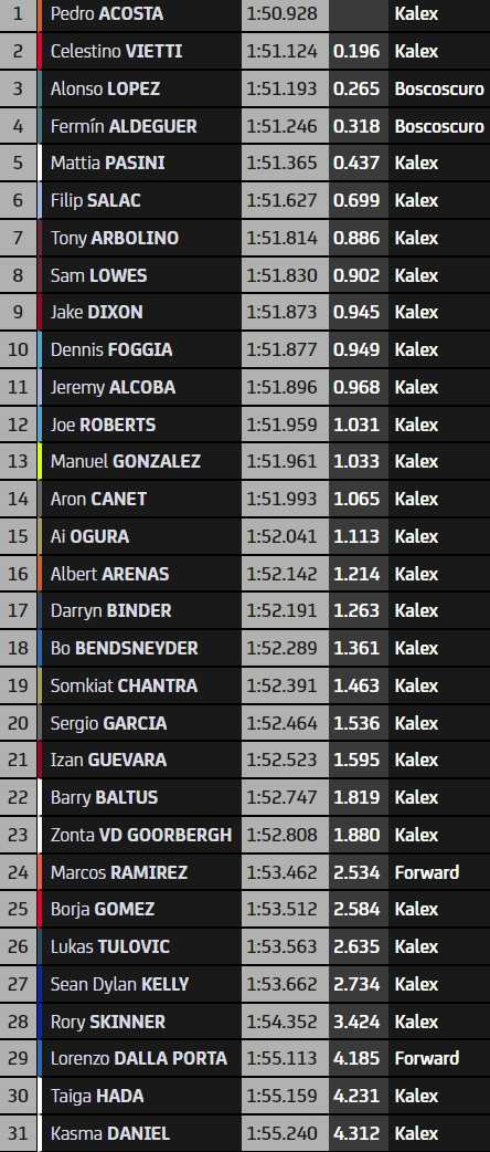 Pedro Acosta a signé le meilleur temps de la première séance d’essais Moto2 du Grand Prix d’Italie. Le leader du championnat, Tony Arbolino, est septième.