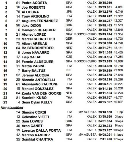Les abandons de Celestino Vietti et d’Aron Canet chamboulent le classement général. Ai Ogura revient à égalité de l’Italien en tête du championnat du monde Moto2, tandis que Joe Roberts n’est plus qu’à 3 points de la médaille de bronze portée par Aron Canet.