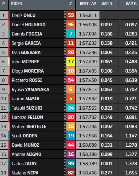 Jamais deux sans trois pour Deniz Öncü. Après Spielberg 2021 et Portimao 2022, le Turc a décroché au Mugello la troisième pole Moto3 de sa carrière, 97 millièmes devant le rookie Daniel Holgado. Dennis Foggia complètera la première ligne à domicile, un rang devant le leader du championnat, Sergio Garcia, face à qui il se bat pour le titre. Passé avec succès par la Q1, le Français Lorenzo Fellon s’élancera 12e.