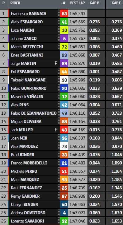 Galvanisés par la présence de Valentino Rossi, Luca Marini (3e) et Marco Bezzecchi (5e) mettent les Ducati VR46 aux avant-postes, avec entre eux la Pramac de Johann Zarco (4e). Le Français se maintient à la même position que celle obtenue vendredi, et peut légitimement aspirer à l’une des deux premières lignes cet après-midi. Son coéquipier Jorge Martin (7e) a chuté mais gagné quelques places, et sera de la partie en Q2. De même qu’Enea Bastianini (6e), également tombé dans son dernier tour alors qu’il chassait le chrono de Francesco Bagnaia.