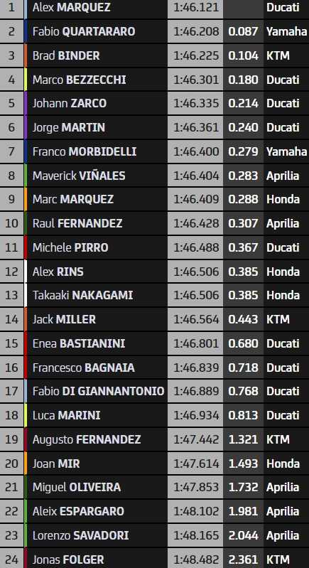 Toujours en quête de son premier podium de la saison, Franco Morbidelli signe un bon septième temps à moins de 3 dixièmes du leader. Maverick Vinales place la première Aprilia au huitième rang (+0.283), un rien devant Marc Marquez (+0.288) meilleur pilote Honda de la séance. De retour après s’être fait opérer du syndrome des loges, Raul Fernandez est un étonnant dixième. Il fait notamment mieux que le pilote d’essai Ducati Michele Pirro (11ème, +0.367), les Honda LCR d’Alex Rins (12ème, +0.385) et Takaaki Nakagami (13ème avec un chrono identique), ou encore la KTM officielle de Jack Miller (+0.443).