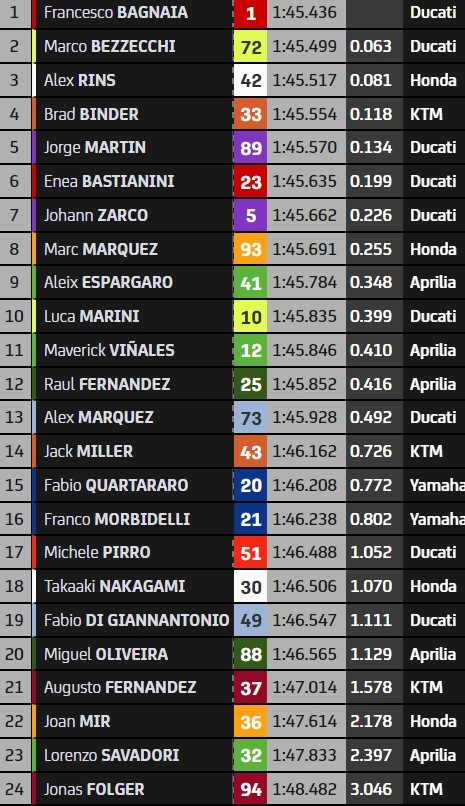 Les 10 pilotes directement qualifiés en Q2 sont : Francesco Bagnaia, Marco Bezzecchi, Alex Rins, Brad Binder, Jorge Martin, Enea Bastianini, Johann Zarco, Marc Marquez, Aleix Espargaro, Luca Marini.
