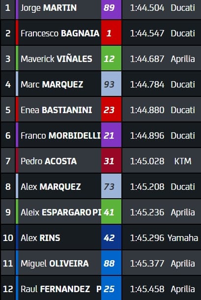 L'Espagnol est le seul pilote du top-6 au guidon d'une autre machine qu'une Desmosedici, car en 2ème ligne, M. Marquez aura à ses côtés Enea Bastianini (5ème) et Franco Morbidelli (6ème), ce-dernier ayant réussi à se sauver en remportant la séance de repêchage. Seul pilote KTM en Q2, Pedro Acosta ouvrira la 3ème rangée au 7ème rang. Meilleur pilote équipé d'une moto japonaise ce samedi, Alex Rins partira 10ème avec sa Yamaha, derrière l'Aprilia d'Aleix Espargaro (9ème) et devant celles de Miguel Oliveira (11ème) et Raul Fernandez (12ème).