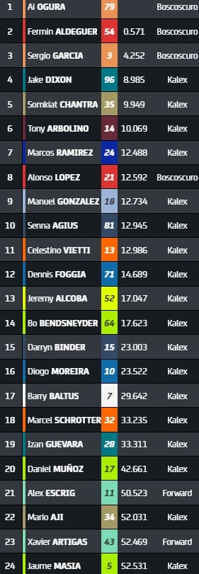 Ogura, dont on parle pour remplacer Takaaki Nakagami chez LCR Honda Idemitsu, profite de l'absence de Joe Roberts, blessé à la clavicule, pour passer deuxième du championnat. Il revient à 14 points de Garcia, vaincu mais auteur de son cinquième podium de l'année. Aldeguer revient lui dans le top-5 du général.