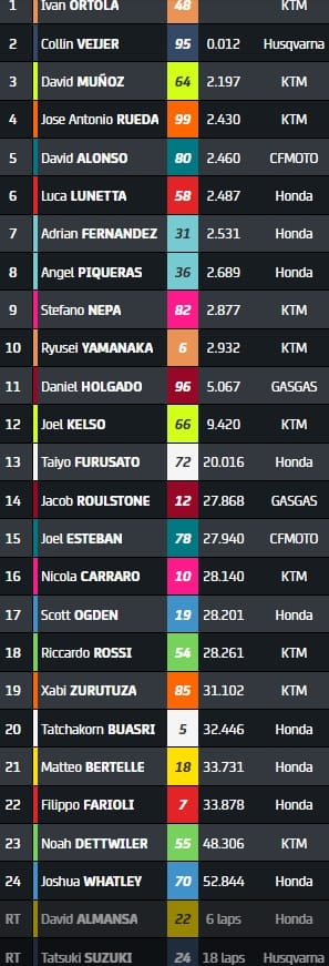 Deux secondes derrière le duo de tête, David Muñoz complète le podium après s'être défait dans le dernier tour du rookie José Antonio Rueda (4e) et du leader du championnat David Alonso (5e). Le Colombien compte désormais 39 points d'avance sur son nouveau dauphin, Veijer, qui dépasse Daniel Holgado classé seulement 11e aujourd'hui.